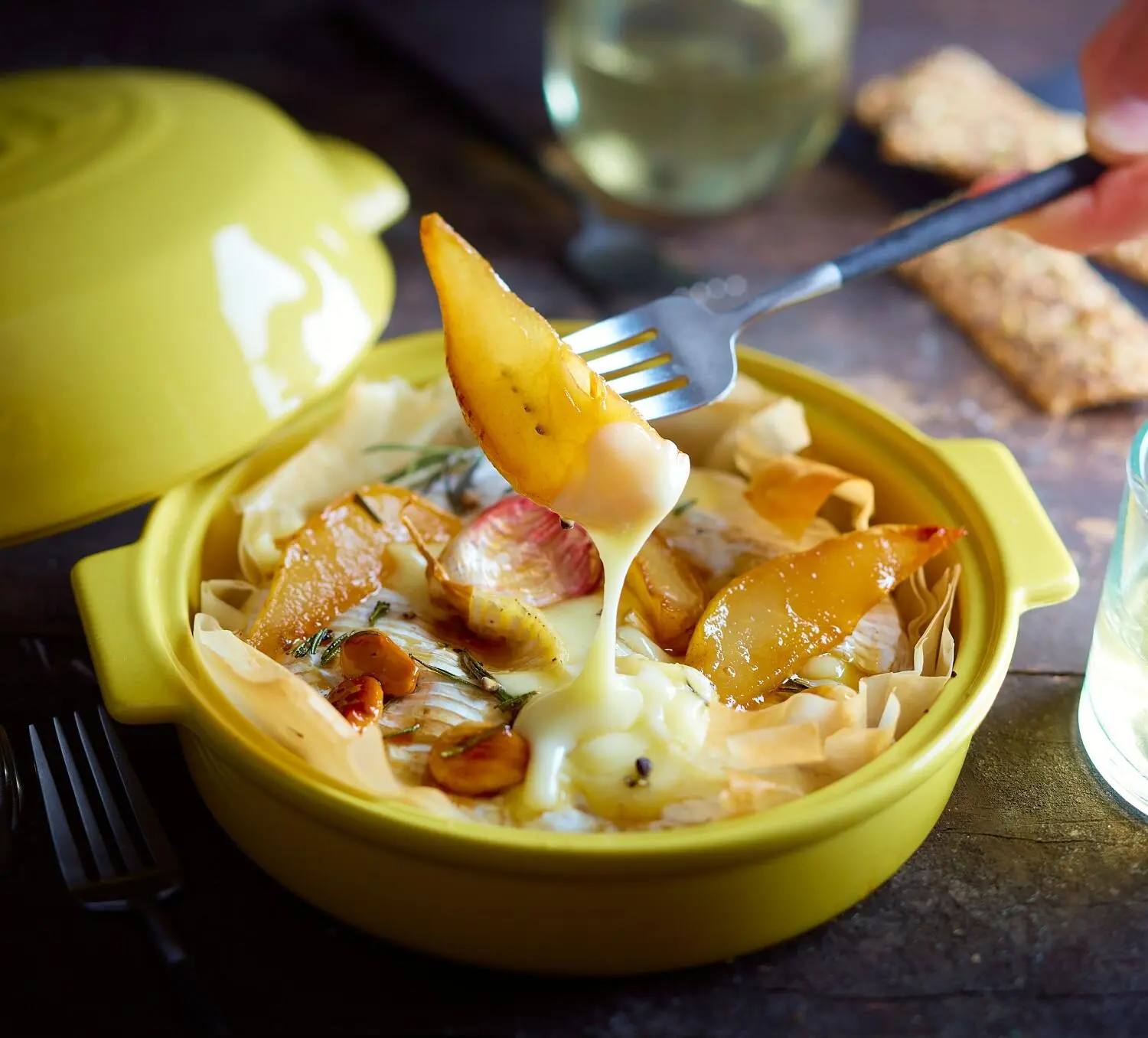 Ob Brie, Mozzarella oder Ziegenkäse: Legen Sie einfach den Käse in den Baker, fügen Sie süße oder herzhafte Beilage hinzu, schließen Sie den Deckel und stellen Sie ihn in den Ofen. Nach dem Backen direkt darin servieren.