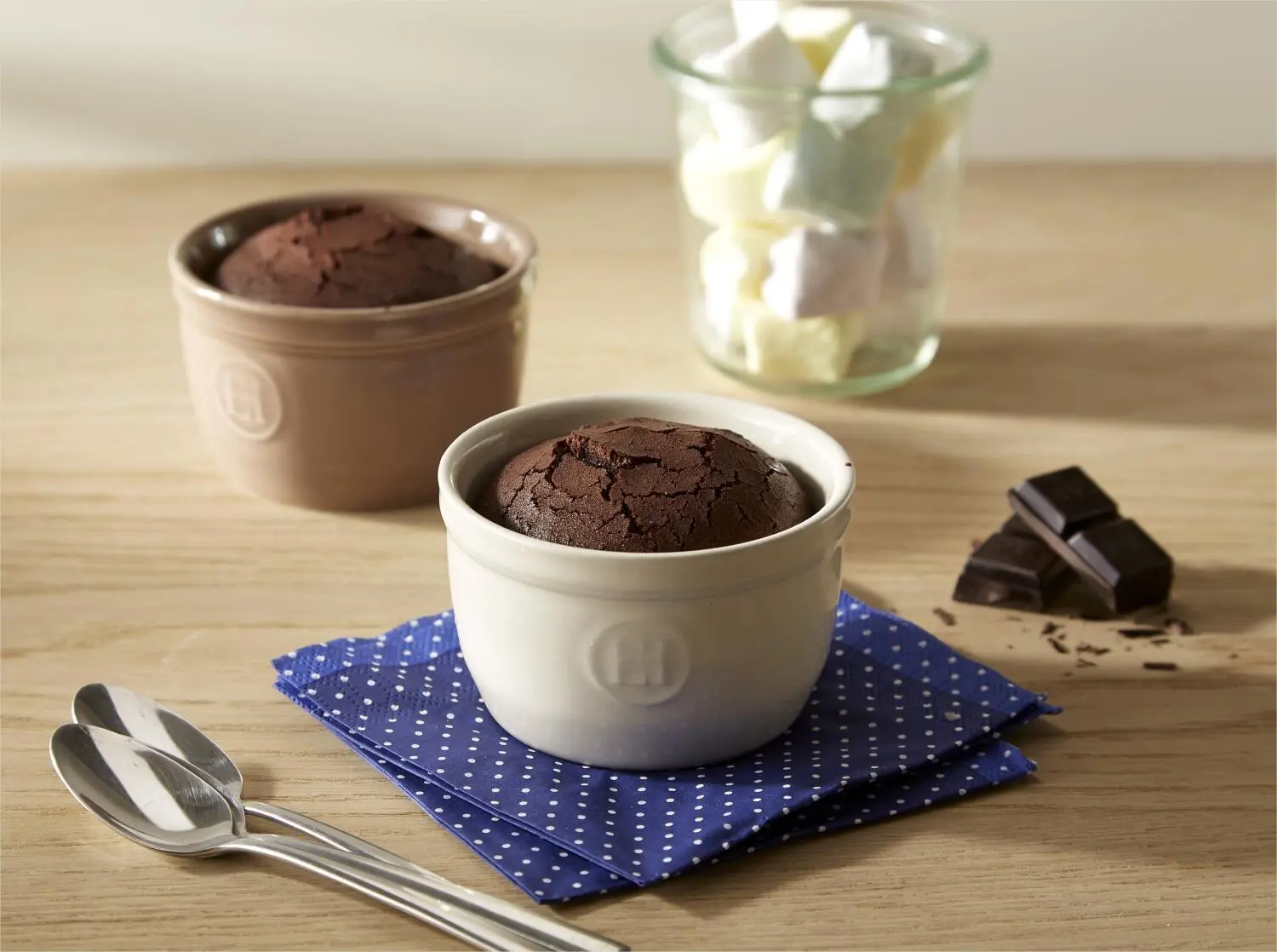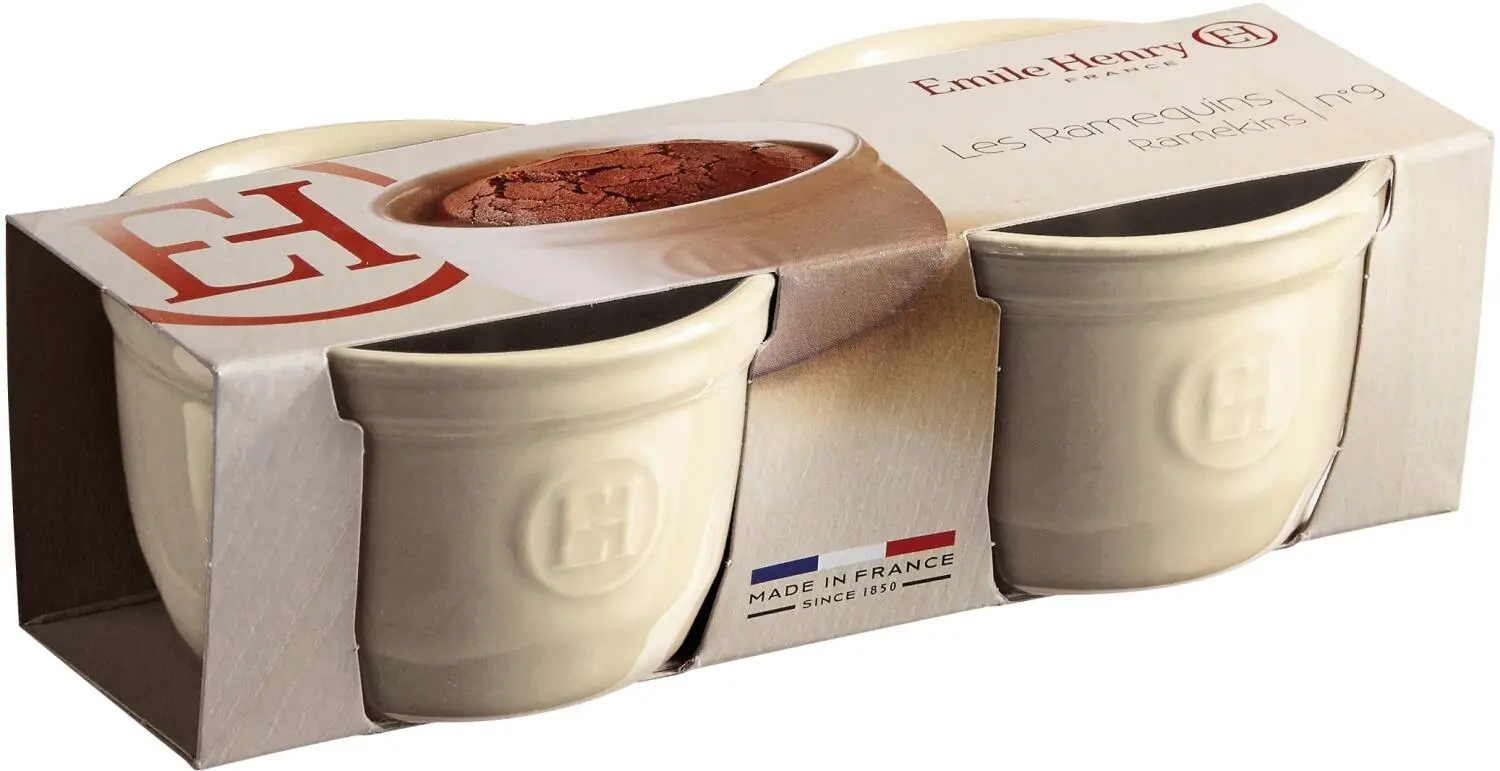 Emile Henry Töpfchen Nr. 9 in ton, 2er Set. Klassisch elegant – ideal für Hefekuchen, Schokoladenfondant und französische Charlotte.