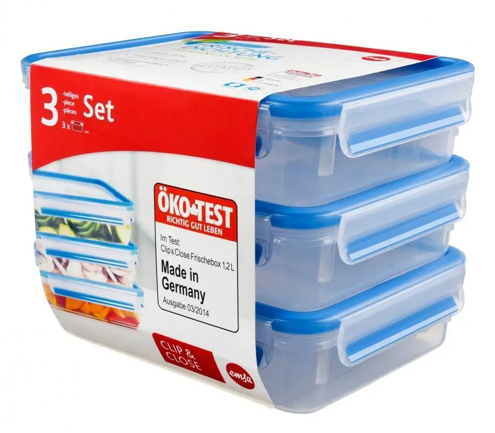Emsa Frischhaltedosen-Set Clip & Close ÖKO-Test, 3-teilig mit 1,2 Liter. Ausgezeichnet von ÖKO-Test. Durch ihre einzigartige Dichtung im Deckel bleibt Frisches einfach länger frisch.