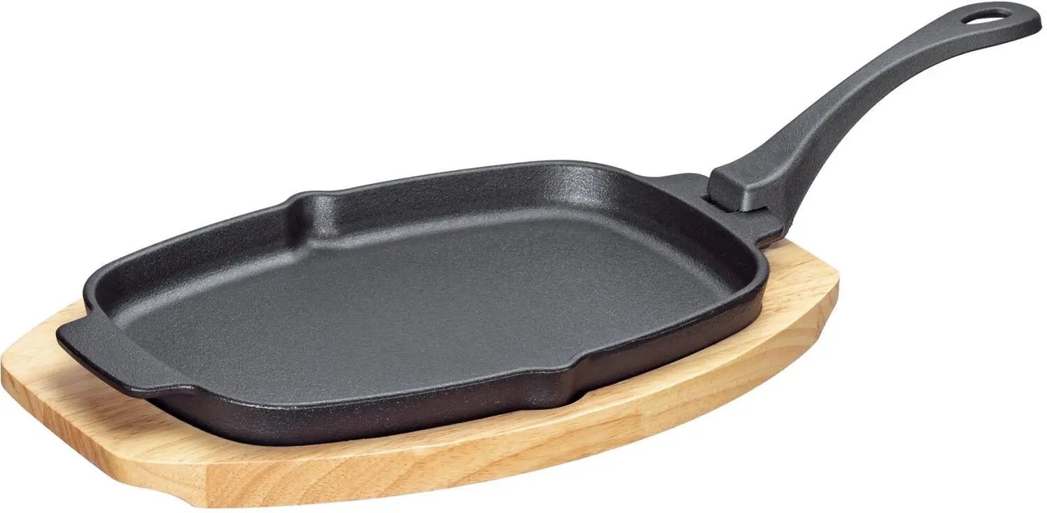 Das wärmespeichernde Material Gusseisen sorgt dafür, dass die zubereiteten Speisen lange heiß bleiben. Dank des Holzbrettes kann die Pfanne auch am Tisch stilvoll serviert werden. Der Transport der Pfanne ist problemlos möglich, denn sie wird in der Mulde sicher gehalten.