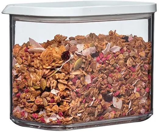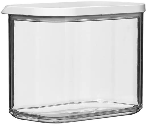 Vorratsdose Modula 1000 ml, mit einem durchsichtigen Deckel mit weißem Rand. Diese rechteckige Dose von Mepal mit abgerundeten Ecken hat ein Volumen von 1 l und ermöglicht einen direkten Blick auf den Inhalt, sogar in der Küchenschublade!