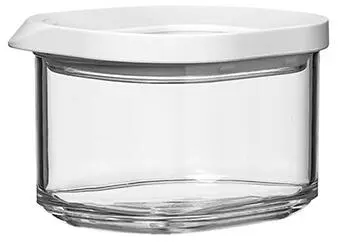 Vorratsdose Modula 175 ml, mit einem durchsichtigen Deckel mit weißem Rand. Diese kleine Dose mit abgerundeten Ecken hat ein Volumen von 175 ml und ermöglicht einen direkten Blick auf den Inhalt, sogar in der Küchenschublade!