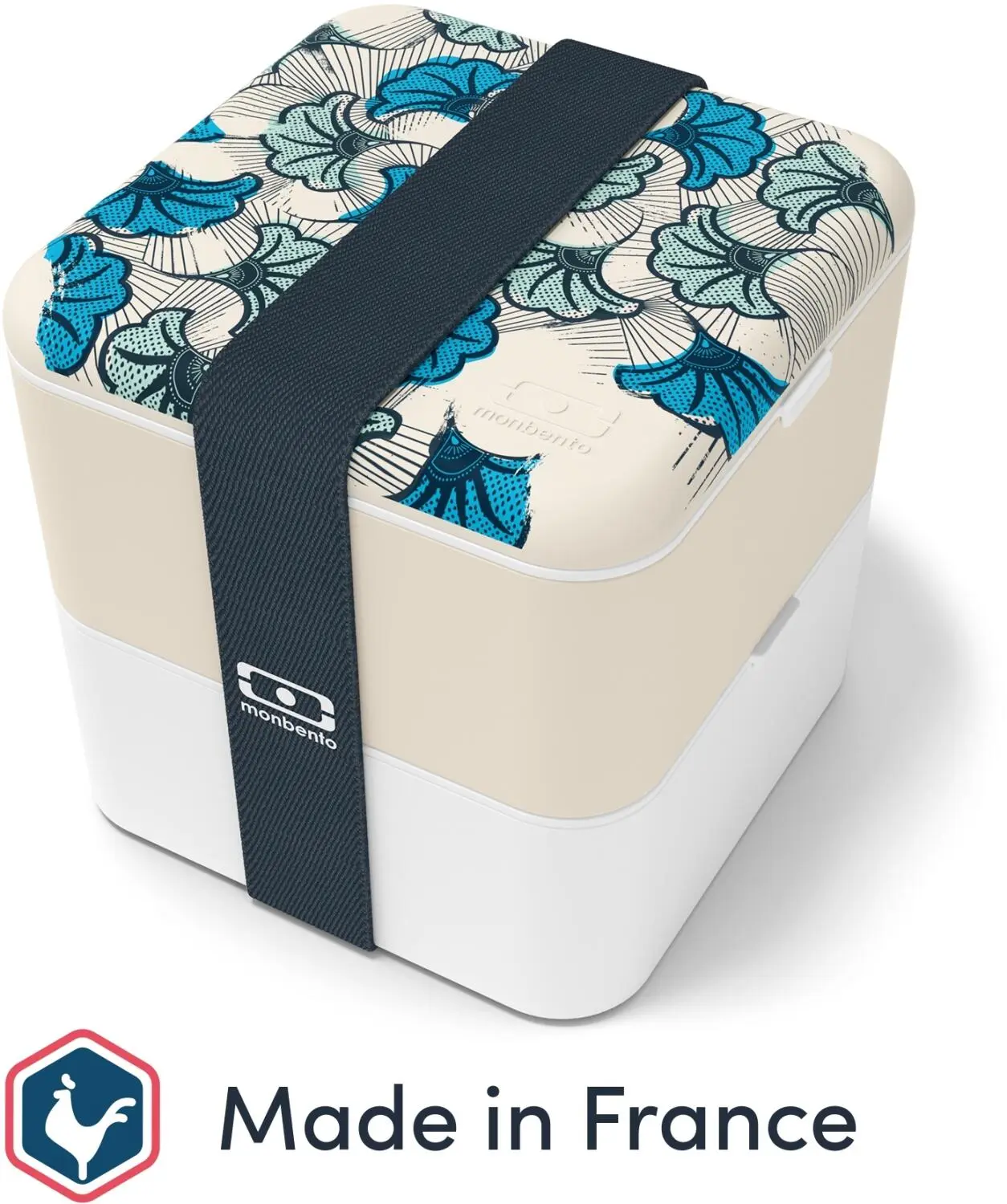 Monbento MB Square Bento-Box Graphic blue wax. Moderne Lunchbox im quadratischen Design. Mit zwei separaten Fächern und Transportbändern. Ideal für Sandwichs und größere Portionen.