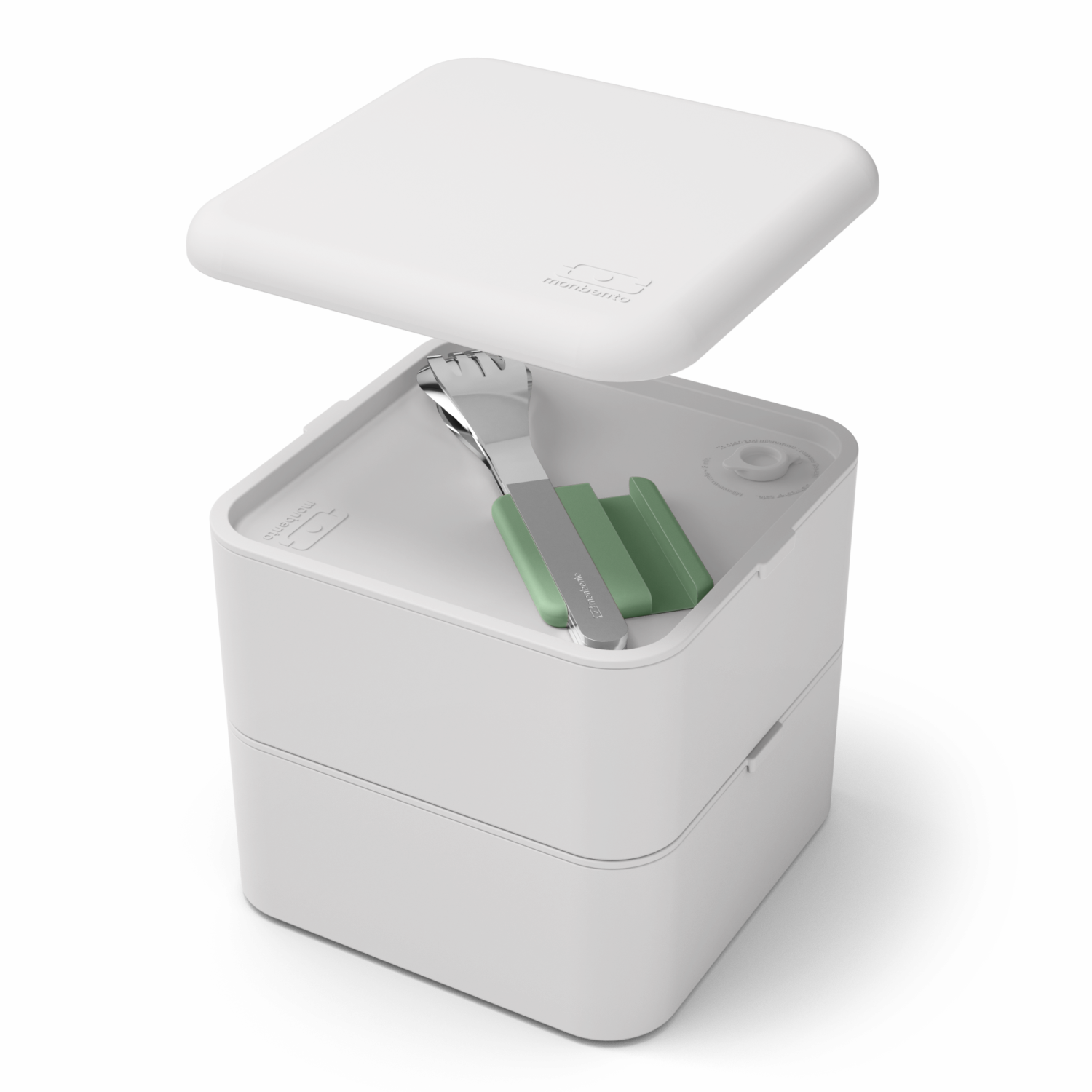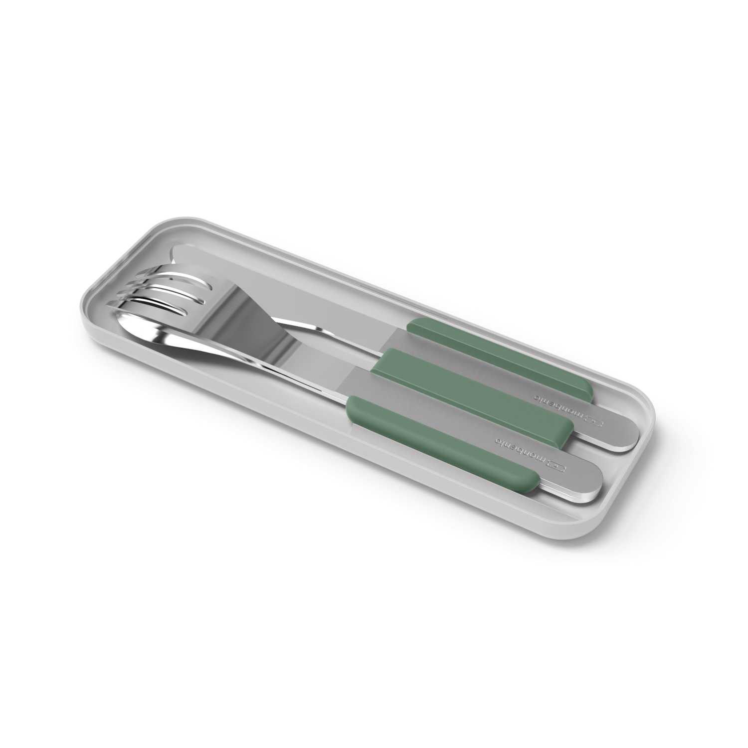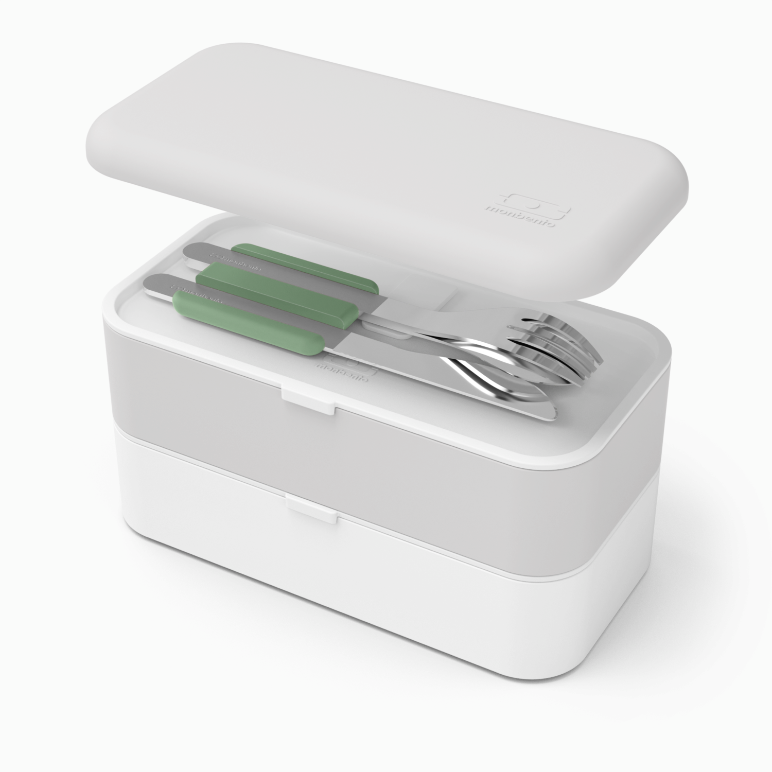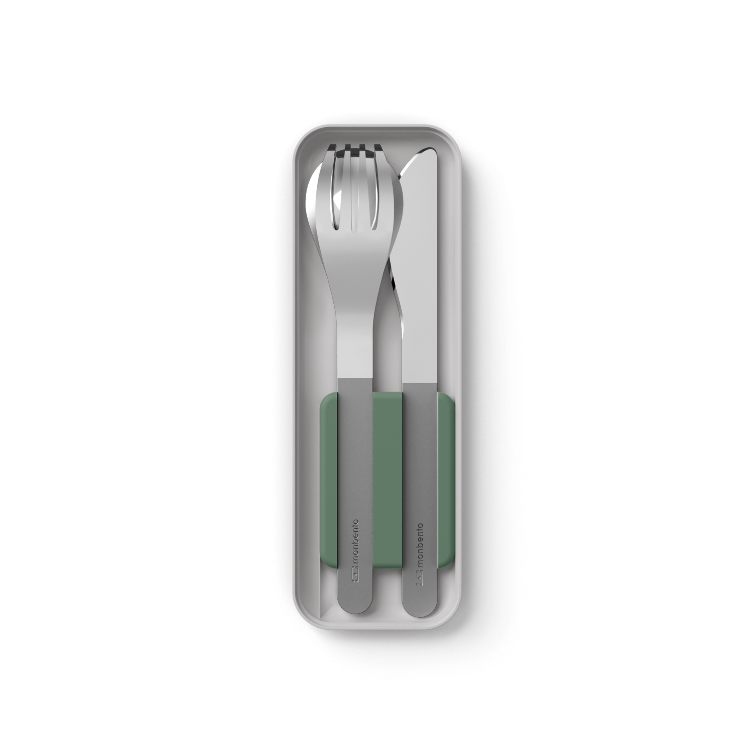 Besteck in grün Natural. Das Besteck aus Edelstahl mit PP-Halterung kann zwischen den Ober- und Zwischendeckeln der MB Original und MB Square Bento-Box befestigt werden. Kompakt, praktisch und ideal für unterwegs! Beim MB Square passt das Messer unten, der Löffel in der Mitte und die Gabel oben aufgelegt.