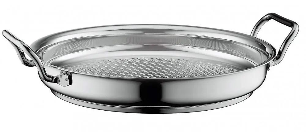 Grillpfanne mit Waffelboden. Ideal zum Anbraten von Bratkartoffeln und Hackgerichten. Dank der Waffelstruktur des Bodens haftet Kurzgebratenes nicht an.