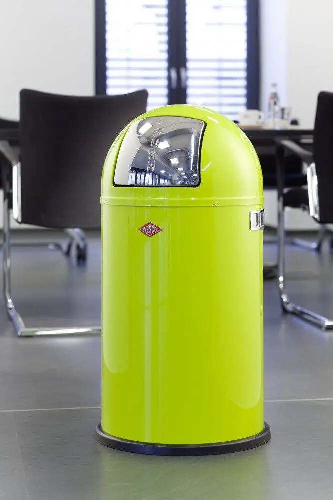 Basierend auf der amerikanischen Idee „großes Volumen – große Einwurfklappe“ wurden Korpus und halbrunde Haube des Abfallsammlers Pushboy so aufeinander abgestimmt, dass die Proportionen perfekt zueinander passen, ergänzt um eine große und technisch stabile Einwurfklappe aus Edelstahl sowie stabile Griffe. Der Müll wird durch die grosse Edelstahl-Klappe eingeworfen, die für eine geruchsfreie Entsorgung des Mülls sorgt.